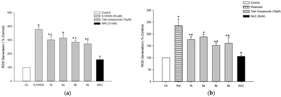 Oxidative stress is believed to be an important precursor of dopaminergic cell damage in PD. Thus, we next assessed the effects of the test compounds on the production of ROS using the cumulative fluorescent dye H2-DCFDA in PC12 cells exposed to 6-OHDA (50 μM) or rotenone (1 μM). Exposure of cells to 6-OHDA for 20 h markedly increased ROS generation, showing approximately 4-fold of control cells. Compounds 7b, 8b, and 8e significantly decreased 6-OHDA-induced ROS generation at the concentration of 10 μM (Figure 13a). At the same concentration, compounds 7b, 8b, and 8e attenuated rotenone-induced intracellular ROS production (Figure 13b). Meanwhile, compound 8a was not effective to inhibit ROS generation in both 6-OHDA- and rotenone-treated cells. NAC was tested as a positive reference drug, which exerted dramatic inhibition of ROS at the concentration tested (5 mM).