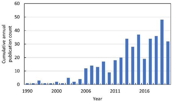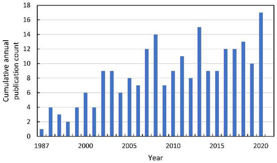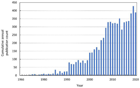 The cumulative annual publication count of papers on oxidative stress in plants. Details of the search are described in Supplementary Materials.