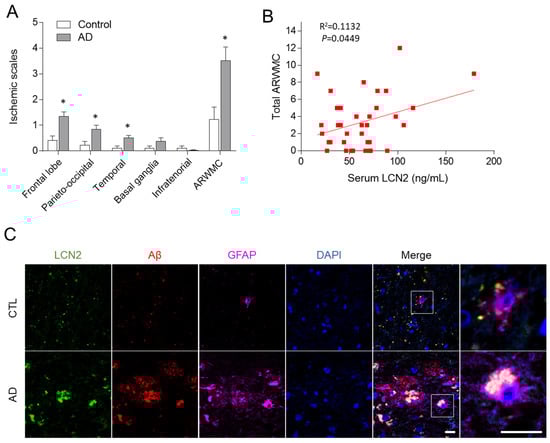 Human LCN2 expression and white matter ischemic changes in AD patients. (A) Assessment of ischemic rating scales in control and AD patients. (B) Correlation between total ARWMC and serum LCN2 levels in AD patients. (C) Representative immunofluorescence images (×200) showing LCN2 (green), Aβ (red), and GFAP (purple) staining in frontal cortex sections from an AD patient. DAPI (blue) was used to stain nuclei. Scale bar = 10 µm. Data are shown as mean ± SEM. * p < 0.05 versus control (CTL).