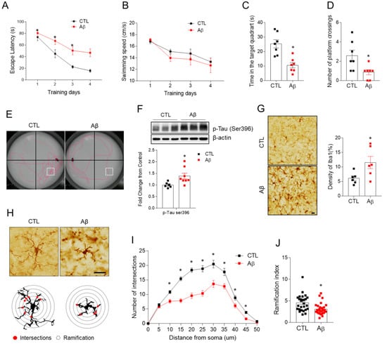 Effects of AβO toxicity on memory deficits, hippocampal tau phosphorylation and microglia activation. The Morris water maze test in control and Aβ-treated mice at 34 weeks. (A) Escape latency and (B) average time spent in swimming speed over 4 days. (C) Time spent in the target quadrant, and (D) number of crossings over the platform area for the three time slices analyzed. (E) Representative swimming paths during the probe trail. (F) Western blot and quantified hippocampal phosphorylated tau (s396) expression. To normalize total protein level, β-actin was used as a loading control. (G) Representative images of Iba-1 immunohistochemistry and quantification of relative optical density (ROD) measurements (%) in hippocampal CA1 regions. Bar = 10 µm (H). The schemes graphically illustrate Sholl analysis of microglia morphology detects. (Red circles indicate Sholl intersections. Circle lines indicate Sholl sphere radius). (I) Average number of intersections at specified distances from the soma in microglia, and (J) Shoenen ramification index; 27 to 31 cells per region of n = 4 mice. Data are mean ± SEM. * p < 0.05 for control compared with Aβ-treated mice.