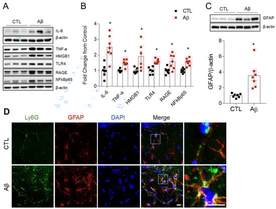 Effects of AβO toxicity on neuroinflammation in the hippocampus. (A) Western blot analysis of IL-6, TNF-α, HMGB1, TLR4, RAGE, and NF-κBp65 in the hippocampus. (B) Quantitation of Western blot analysis in (A). To normalize total protein level, β-actin was used as a loading control. (C) Western blot and quantified hippocampal GFAP expression. To normalize total protein level, β-actin was used. The data are presented as mean ± SEM. * p < 0.05 for control compared with Aβ-treated mice. (D) Representative immunofluorescence images (×200) of hippocampal CA1 regions showing Ly6G (green) and GFAP (red) staining. DAPI (blue) was used to stain nuclei. Scale bar = 10 µm.
