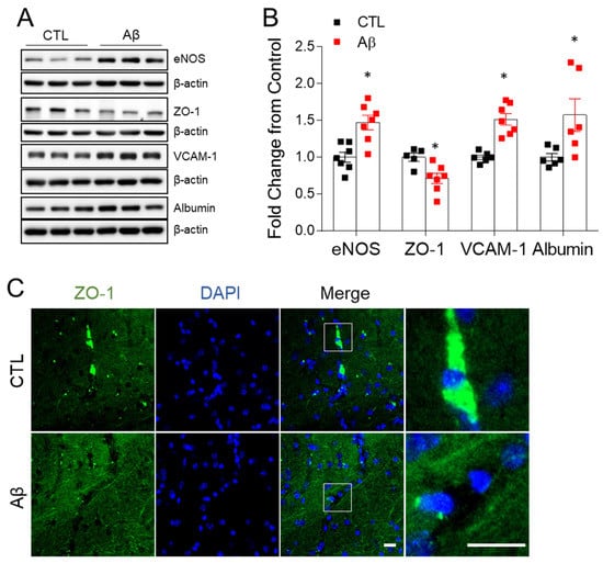 BBB dysfunction occurs in the early stage of AD [,,]. In addition to the leakage of neutrophils, we evaluated changes in the factors associated with BBB morphology and permeability. In Western blot and immunohistochemistry analyses, exposure to AβO compromised zonula occludens-1 (ZO-1), resulting in molecular alterations at the BBB tight junction (Figure 4). Increased albumin levels were reported in the AD mouse model, indicating that the BBB had been disrupted on a wide scale (Figure 4A,B). Elevated endothelial nitric oxide synthase (eNOS) and vascular adhesion protein 1 (VCAM-1) protein levels (Figure 4A,B) are consistent with the promotion of greater BBB permeability.