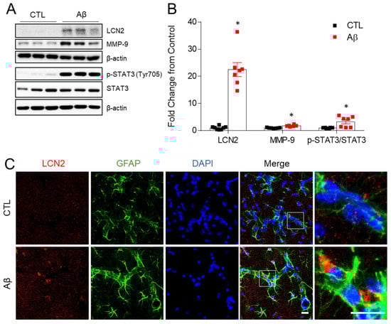Matrix-metalloproteinase 9 (MMP9) is known to increase BBB permeability and activate neuroinflammation [] and MMP9 was increased by intracerebral injection of Aβ in the mouse hippocampus []. In a previous study, we showed that MMP9 and LCN2 expression increased simultaneously in hippocampal neurons of ob/ob mice, and that both were located in close proximity []. Thus, we first determined hippocampal LCN2 protein. LCN2 expression was significantly in AβO-treated mice compared to controls (Figure 5A,B). MMP9 did also increase in the hippocampus of AD mice, as did phosphorylated signal transducer and activator of transcription 3 (STAT3) (Figure 5A,B). LCN2 expression was observed in GFAP-labeled astrocytes (Figure 5C). LCN2 from astrocytes is known to activate STAT3, and activated STAT3 promotes the production of pro-inflammatory cytokines, including MMP9, TNF-α, and IL-6 [,].