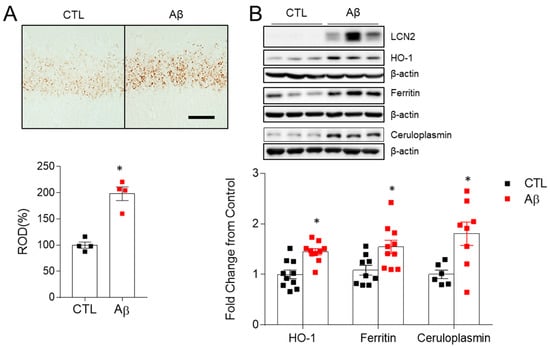 Effects of AβO toxicity on iron accumulation and oxidative stress in the hippocampus. (A) Histological staining (×100) for iron with DAB-enhanced Perls’ staining in the hippocampal CA1 regions and relative optical density (ROD) measurements (%). Scale bar = 25 µm. (B) Western blots and quantified hippocampal HO-1, Ferritin, and Ceruloplasmin expressions. β-actin was used as a loading control. As shown in Figure 5A, AβO-induced LCN2 is also enhanced in same Western blot used in HO-1. The data are presented as mean ± SEM. * p < 0.05 for control compared with AβO-treated mice.