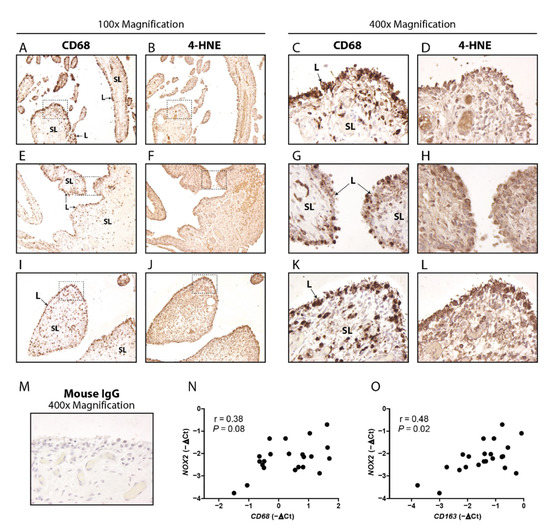Macrophage marker CD68 and oxidation marker 4HNE are particularly present in the lining of human OA synovium, and CD163 positively correlates with NOX2. Immunohistochemical staining of CD68 (A,C,E,G,I,K) and 4HNE (B,D,F,H,J,L) was performed on sections of human OA synovium (100× and 400× magnification). Adjacent sections from synovium of three different patients are shown (A–L). Dashed square shows area of 400× magnification. L = lining, SL = sub-lining. Mouse IgG was used as isotype control (M). mRNA expression of NOX2 did not correlate with CD68 (N), but did positively correlate with CD163 (O) in human OA synovium.