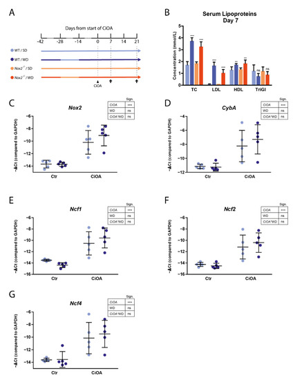 Wild type (WT) C57Bl6/J mice were obtained from Charles River, and Nox2−/− and Ncf1*/* mice (carrying a natural loss-of-function single nucleotide polymorphism in Ncf1) with a C57Bl6/J background were obtained from Jackson and subsequent in-house breeding. Female and male WT and Nox2−/− mice were 21 weeks old at the time of induction of the disease model, were housed in individually ventilated (IVD) cages and received food and water ad libitum. Cages were allocated to end-point day 7 or day 21 of CiOA and were fed either standard diet or WD (15% cacao butter, 1% cholesterol, 0.05% sodium cholate. Metabolized energy: 43% from fat, 42% from carbohydrates, 15% from protein (Sniff Spezialdiäten GmbH, Soest, Germany)), starting six weeks before induction of the disease model (switching back to standard diet temporarily from week −4 to −2 prior to induction (Figure 2A)) and continuing until the end of the experiment. Mice with dislocated joints were excluded from analysis, since dislocated joints develop extreme CiOA symptoms that are not anymore comparable to normal CiOA. Cage to experimental group allocation was done so that the age-spread and number of mice per cage were most optimally matched between experimental groups. Animal studies were approved by the Institutional Review Board and were performed according to the related codes of practice (CCD project number: 2018-0002).