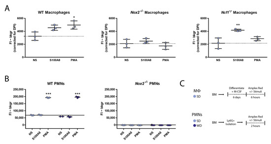 Nox2−/− macrophages produce basal levels of ROS but fail to upregulate these upon stimulation with PMA and S100A8. (A) Amplex Red assay readout (@545-15nm) of WT, Nox2−/− and Ncf1*/* macrophages differentiated for six days in presence of M-CSF (15 ng/mL) (C), and of WT an Nox2−/− PMNs (B) isolated from fresh bone marrow using positive selection of Ly6G+ cells (C). Data are presented as mean and SD. *, p < 0.05; **, p < 0.01; ***, p < 0.001 compared to non-stimulated (NS).