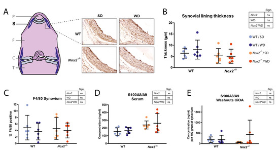 Nox2 knockout does not affect synovial lining thickness and S100A8/A9 expression at day seven of CiOA. (A) Illustration shows a schematic overview of a frontal section of an H&E-stained knee joint. P, patella; S, synovium; F, femur; C, cartilage; T, tibia. Pictures show sections immunohistochemically stained for F4/80 and are representative of the mean of each group (400× magnification). (B) Synovial lining thickness at day seven of CiOA was scored on F4/80-stained histological sections by measuring the thickness in µm. Three sections of different standardized depths were scored per knee joint. (C) F4/80 positive staining was measured and quantified as the percentage of positive staining in the outer 200 µm of synovium. (D,E) Concentrations of S100A8/A9 in serum (D) and synovial washouts (E) using ELISA. Data are presented as mean and 95% CI’s. n = 10. p-value summary resulting from two-way ANOVA shown in tables: **, p < 0.01; ns, p > 0.05. No mice were excluded from analysis.