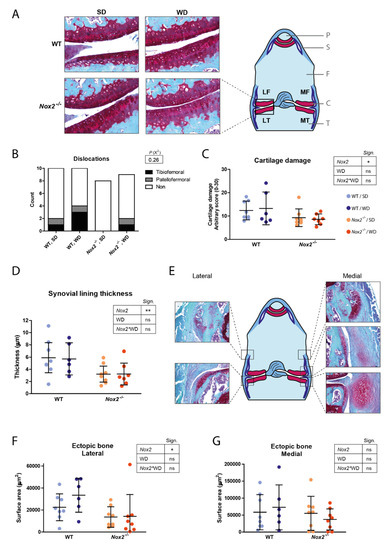 Finally, we used histological sections of day 21 to assess whether Nox2 deficiency reduced the degenerative disease manifestations typical of end-stage OA; cartilage damage and ectopic bone formation. Crucially, Nox2 deficiency had a protective effect on structural cartilage damage compared to WT mice. This was shown by a 30% reduction in cartilage damage score in Nox2−/− mice compared to WT mice (p = 0.028) (Figure 5A,C). Whereas synovial lining thickness was not found to be affected by Nox2 deficiency at day 7 of CiOA, it was significantly reduced at day 21 (44% reduction compared to WT, p = 0.006). In addition to cartilage damage and synovitis, the incidence of ectopic bone masses was visibly reduced in the lateral side of the knee joint of Nox2−/− mice compared to WT mice (Supplementary Figure S3). Also the average surface area of ectopic bone was decreased in Nox2−/− mice compared to WT mice at the lateral side of the knee joint (50% reduction compared to WT, p = 0.015) (Figure 5E–G). Although WD-feeding did not have an effect on cartilage damage and ectopic bone formation (p = 0.22), the number of dislocations (which were excluded from further analyses) were higher in WD-fed mice in both female and male mice, especially in WT mice (p = 0.26 in female and p = 0.04 in male mice) (Figure 5B and Supplementary Figure S1A).