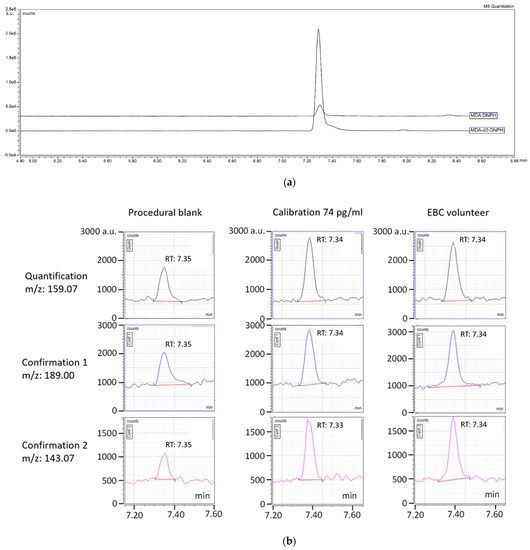 Figure 1 shows a typical liquid chromatogram for a procedural blank as well as the lowest standard level and an EBC sample using the optimized conditions. For the procedural blank, the signal at 7.35 min was identified as MDA-DNPH, as both the quantification ion (m/z 159) and confirmation ions (m/z 143 and m/z 187) presented the same retention time as the standard MDA. This indicated that an MDA source was present in the reactives used for this analysis. The contribution of this procedural blank to the signal of the lowest MDA concentration (74 pg/mL) was relatively large and variable, ranging from 45% to a maximum of 90%, depending on the day (SD: 15%, n = 12). To decrease such interferences, we tried to purify the DNPH derivatization solution by using a liquid-liquid extraction following Mendoca et al. [41]. However, this approach was unsuccessful, attributed to the small polarity difference between DNPH and MDA-DNPH. Changing the type of glassware, tips and other crimp caps did not reduce this contamination. We also examined the use of butylhydroxytoluene ((BHT), 10 μL of 2% BHT solution in the samples), considered by many authors as essential to prevent oxidation reactions leading to artifactual production of MDA [16]. We didn’t observe any improvement with BHT. Lastly, we examined if there could be a crosstalk between the MDA-d2 and the standard in a situation where protons might exchange with both deuterium in MDA-d2 and induce an internal contamination. We did not observe any modification in procedural blank when 5 times more internal standard was injected into the solution (Supplementary Material, Figure S5). Nevertheless, we observed that a reduction of the amount of organic solvent in favor of water in the DNPH derivatization solution decreased significantly the signal in the procedural blank (one-way ANOVA p = 0.038, data not shown). We also observed that this blank signal increased by 162% by re-using a DNPH solution stored at 4 °C for 1 day (n = 8). These results highlight the need to introduce procedural blanks in the analytical method to control the variation of contamination between batches and to use freshly prepared DNPH solutions. As we could not eliminate this signal, the EBC results had to be corrected with this procedural blank.