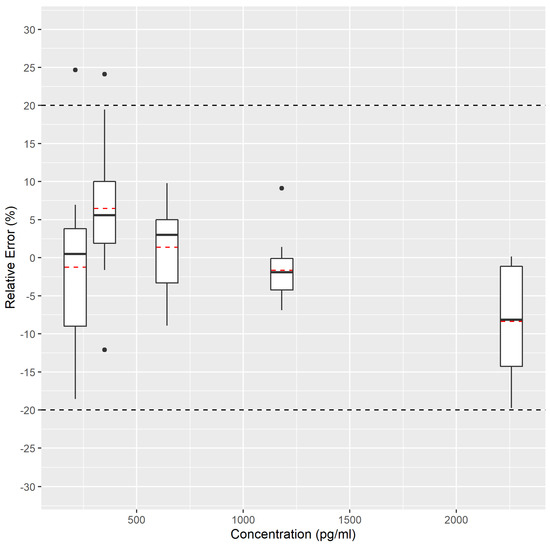 Accuracy profile for MDA analysis in EBC represented in the form of a box-and-whisker plot. The figure denotes the measured relative error compared to the targeted spiked concentration. The black central line represents the median value (50th percentile) whereas the red dashed lines represent the average value. The upper and lower whiskers correspond to the adjacent values as defined by Tukey [42]. Black dots correspond to data points falling outside the adjacent values that can be considered as potential outliers. Theywere plotted separately. The external dashed lines correspond to the acceptance limits (fixed at 20%).