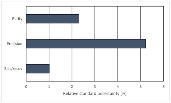 The contribution of the three identified components to the uncertainty was determined using the data generated during the method validation process for EBC QC samples (Figure 3). The precision (repeatability) was the largest contributor to the uncertainty, reaching an average value of about 5.2%.
