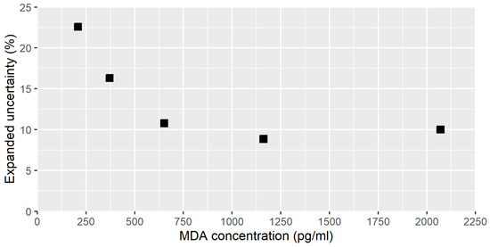 Figure 4 presents the calculated expanded uncertainty for the different MDA concentration in EBC, using a coverage factor of 2. As expected, the lowest uncertainty (≤10%) was observed for MDA concentrations above 650 pg/mL, whereas it increased to 23% for MDA concentrations near the LOQ.
