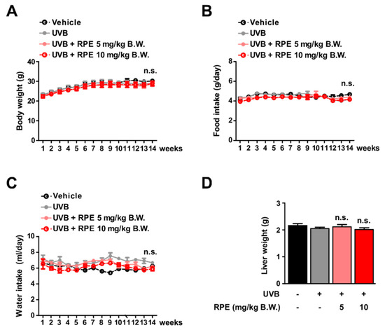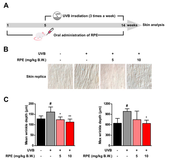 3.1. Oral Consumption of Rosa gallica Petal Extract (RPE) Suppresses UVB−Mediated Skin Wrinkle In Vivo