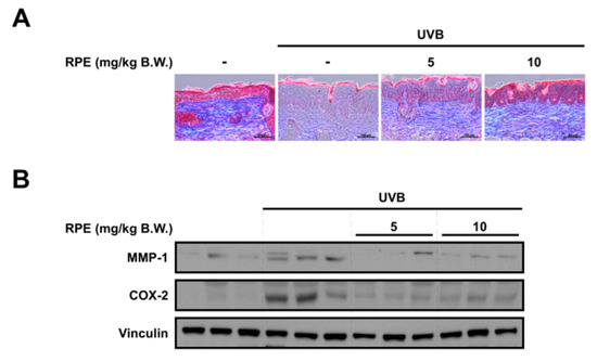 3.3. RPE Inhibits Collagen Degradation and Blocks UVB−Mediated Biomarker of Skin Aging