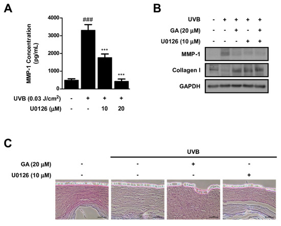 3.7. MEK Inhibition and Gallic Acid Blocks UVB−Induced MMP−1 Expression and Collagen Reduction in Reconstructed 3D Human Skin Model