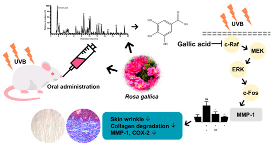 Jo, S.; Jung, Y.-S.; Cho, Y.-R.; Seo, J.-W.; Lim, W.-C.; Nam, T.-G.; Lim, T.-G.; Byun, S. Oral Administration of Rosa gallica Prevents UVB−Induced Skin Aging through Targeting the c−Raf Signaling Axis. Antioxidants 2021, 10, 1663. https://doi.org/10.3390/antiox10111663
