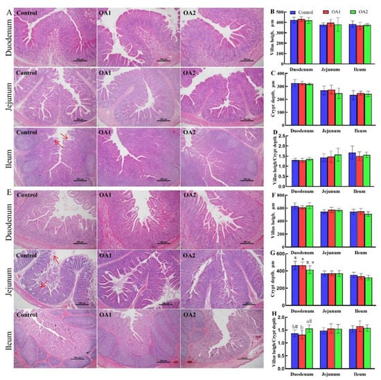 The small intestinal histology results are presented in Figure 1. The histopathology results showed that fragmentation of villi and slight vacuolar degeneration of epithelial cells were observed in the ileum (day 14) and jejunum (day 49) of the control group (Figure 1A,D, red arrow). Notably, the intestinal morphology results showed that OA2 tended to reduce (p < 0.10) crypt depth (Figure 1G) and significantly increased or tended to increase (p < 0.05 or 0.10) the ratio of villus height:crypt depth (Figure 1H) in the duodenum at day 49 compared to those of the control and OA1. The chyme digestive enzyme activity results are presented in Table 3. The jejunal chyme α-amylase, lipase, and neutral protease activities were not affected (p > 0.10) by both OA1 and OA2 at both days 14 and 49.
