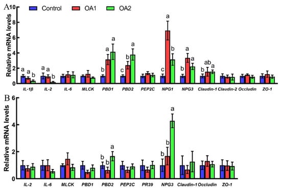 The effects of acidifiers on gene expression results are shown in Figure 2. Compared to the control, both OA1 and OA2 increased (p < 0.05) host defense peptides (PBD1, PBD2, NPG1, and NPG3), while only OA2 decreased (p < 0.05) cytokines (IL-1β and IL-2) and increased (p < 0.05) tight junction genes (claudin-1) at the mRNA level in the jejunum at day 14. Notably, OA2 decreased (p < 0.05) IL-1β, IL-2, and NPG1, while it increased (p < 0.05) PBD2 at the mRNA level in the jejunum compared to OA1 at day 14. At day 49, OA2 increased (p < 0.05) the mRNA abundance of PBD2 and NPG3 in the jejunum compared to those of the control and OA1.