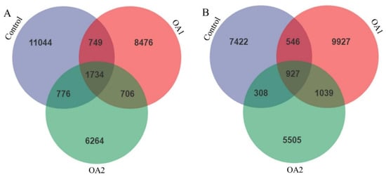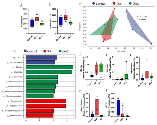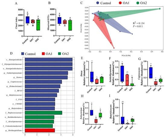 At day 14, the alpha diversity index (Chao1 index and observed OTUs) for the microbiome analysis of OA2 tended to decrease (p < 0.10) when compared to the control (Figure 5A,B). Interestingly, the alpha diversity index of OA1 was higher (p < 0.05) than of OA2 (Figure 6A,B) at day 49. The results of principal coordinates analysis using Jaccard distances showed that the control was differentiated (p = 0.011) at day 14 (Figure 5C) and was greatly (p = 0.001) differentiated at day 49 (Figure 6C) compared to those of OA1 or OA2.