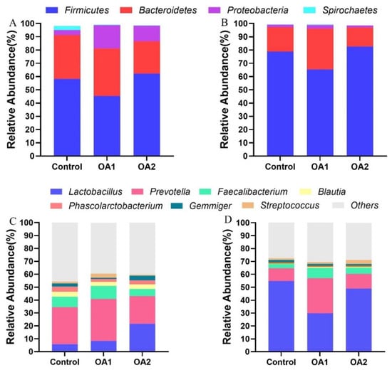 The effects of acidifiers on gut microbiota are shown in Figure 3, Figure 4, Figure 5 and Figure 6. The qualified sequences were clustered into amplicon sequence variants (ASVs) according to sequence similarity (>97%; File S1). Interestingly, more ASVs were identified in the three groups, and the three diet groups shared 1734 ASVs at day 14 (Figure 3A) and 927 ASVs at day 49 (Figure 3B) in cecum chyme. From the analysis of taxonomic composition, both OA1 and OA2 altered the relative abundance of intestinal bacteria at both the phylum and genus levels. All the qualified sequences from the cecum chyme samples were then assigned to 25 known phyla (File S2). Of them, four phyla, Firmicutes, Bacteroidetes, Proteobacteria, and Spirochaetes, were predominantly found (Figure 4A,B). Moreover, 50 predominant genera were assigned from all the qualified sequences (File S3), and seven genera, including Lactobacillus, Prevotella, Faecalibacterium, Blautia, Phascolarctobacterium, Gemmiger, and Streptococcus, were predominantly found (Figure 4C,D).