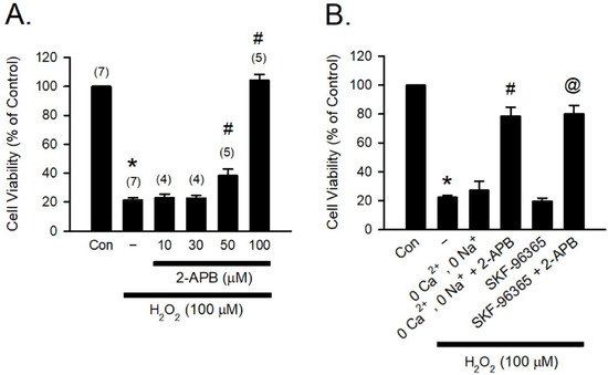 3.1. Involvement of 2-APB-Sensitive Channels in the Protective Effect of 2-APB on the H2O2-Induced Cell Death