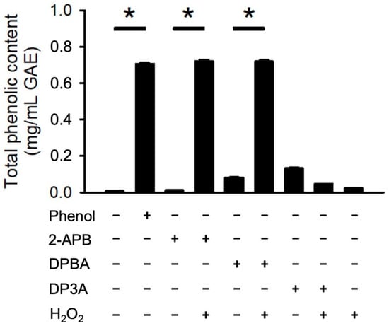 The phenolic content of the generated compounds was determined using the Folin–Ciocalteu method as previously described with small modification [24,25]. Briefly, 10 mM of 2-APB, DPBA, or DP3A was mixed with 10 mM H2O2, and subsequently kept at RT for 10 min. Each group of the tested sample (10 μL) was then mixed with 75 μL of 10-fold diluted Folin–Ciocalteu reagent (Sigma-Aldrich, Saint Louis, MO, USA), and incubated at RT for 5 min. Then, 75 μL of 6% sodium carbonate was added, and the reaction mixture was kept at RT for 10 min before phenolic content was measured using a spectrophotometer at 760 nm. Gallic acid (Sigma-Aldrich, Saint Louis, MO, USA) dissolved in ethanol/water (75:25, v/v, 0.3% HCl) was used as the standard to evaluate total phenolic compounds.