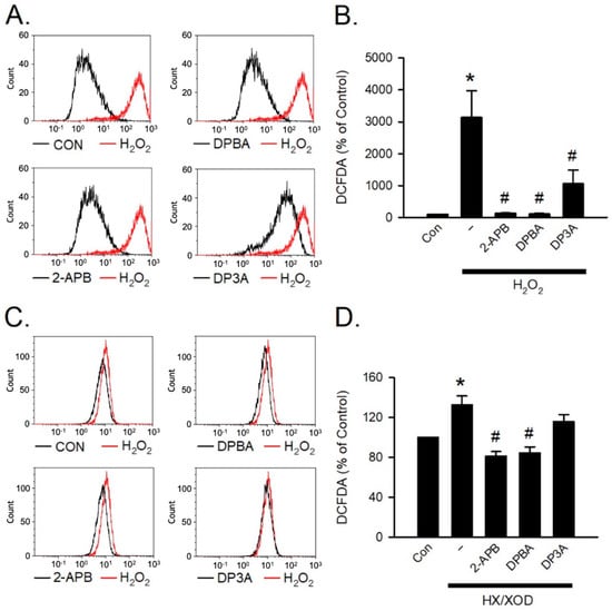 H2O2 and hypoxanthine/xanthine oxidase (HX/XOD) are commonly used for inducing oxidative stress [40]. To investigate the inhibition effect of 2-APB analogues on the intracellular H2O2, the HX/XOD system was used. Briefly, a superoxide anion was generated by HX/XOD system, and subsequently transformed into H2O2 by superoxide dismutase (SOD). To assess whether 2-APB, DPBA, and DP3A could scavenge intracellular H2O2, flow cytometric analysis was conducted using H2DCFDA (a H2O2 indicator). Our data showed that 2-APB, DPBA, and DP3A could inhibit the intracellular H2O2 elevation in the cells exposed to H2O2 (100 μM) (Figure 4A,B), whereas the HX/XOD-induced intracellular H2O2 elevation could only be inhibited by 2-APB and DPBA, but not by DP3A (Figure 4C,D).