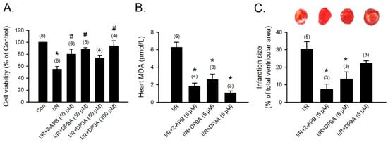 Protective effects of 2-APB, DPBA, and DP3A on the I/R-induced cell death, myocardial infarction, and lipid peroxidation. (A) 2-APB, DPBA, and DP3A inhibited the I/R-induced cell death. Isolated adult rat cardiomyocytes were exposed to ischemia for 30 min, followed by 2 h reperfusion with 2-APB, DPBA, or DP3A. MTT assay was used to determine cell viability. * p < 0.05 different from control; # p < 0.05 different from the I/R group. (B) 2-APB, DPBA, and DP3A inhibited lipid peroxidation after I/R. * p < 0.05 different from the I/R group. (C) 2-APB and DPBA, but not DP3A, decreased myocardial infarct size induced by I/R. Isolated rat hearts were perfused by a Langendorff system. The hearts were stable for 20 min, and then exposed to 30 min ischemia followed by 1 h reperfusion with 2-APB, DPBA, or DP3A. Myocardial infarct size was determined by Triphenyl tetrazolium chloride (TTC) staining. The infarct size was expressed as a percentage of left ventricular volume for each heart. * p < 0.05 different from the I/R group. Values shown in parenthesis represent the number in each group. Data are expressed as mean ± SEM. Abbreviations: I/R, ischemia/reperfusion; MDA, malondialdehyde.