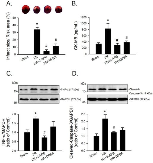 Protective effects of 2-APB and DPBA on the I/R-induced myocardial infarction, inflammation, and apoptosis in an in vivo I/R model. (A) Both 2-APB and DPBA at a concentration of 3 mg/kg significantly decreased infarct size/risk area induced by I/R. (n = 4). (B) Both 2-APB and DPBA at a concentration of 3 mg/kg significantly decreased the levels of creatine kinase-MB (CK-MB). (n = 4). 2-APB (3 mg/kg) significantly reduced the levels of TNF-α (C), and cleaved-caspase-3 (D). Top panel shows representative Western blot analyses. Bottom panel shows graphs of quantification of these data adjusted with GAPDH protein level and expressed as ratio over the corresponding control. (n = 4). * p < 0.05 different from the sham group; # p < 0.05 different from the I/R group. Data are expressed as mean ± SEM. Abbreviations: CK-MB, creatine kinase-MB; GAPDH, glyceraldehyde 3-phosphate dehydrogenase; I/R, ischemia/reperfusion; TNF-α, tumor necrosis factor-α.