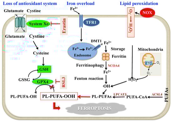 Schematic molecular mechanisms of ferroptosis. Loss of antioxidant system: System Xc- facilitates the cellular uptake of cystine, which is reduced by cystine reductase to cysteine, a key precursor in GSH synthesis. GSH serves as an important reducing cofactor for GPX4 (which catalyzes the reduction of lipid peroxides to their corresponding alcohols) while also forming GSSG. Erastin inhibits the cellular uptake of cystine, thus impairing intracellular GSH synthesis. Depletion of GSH leads to the indirect inactivation of GPX4, and the resulting accumulation of lipid peroxides disrupts membrane integrity resulting in ferroptosis. RSL3 acts by directly inactivating GPX4 and does not interfere with the cellular uptake of cystine or intracellular GSH synthesis. Intracellular iron accumulation: Circulating iron (Fe3+) bound to transferrin enters into cells by TFR1, localizes in endosomes where it is deoxidized to Fe2+. Ultimately, Fe2+ is released into a labile iron pool in the cytoplasm by DMT1, while excess iron is stored in ferritin. Under certain circumstances, there may be degradation of ferritin through autophagy, which is termed as “ferritinophagy”, a phenomenon that triggers an increase in labile iron pool and ·OH via the Fenton reaction. This process requires H2O2 production by activation of NOX, or mitochondria ETC pathways. Lipid peroxidation: The generation of PL-PUFAs by ACSL4 and LPCAT3 have a main role in promoting lipid peroxidation. At the final step of ferroptosis, lipid peroxidation directly or indirectly induces pore formation of cell membrane, thus triggering cell death. Abbreviations: ACSL4: Acyl-Coenzyme A synthetase long-chain family member 4; DMT1: Divalent metal transporter 1; ETC: Electron transport chain; GPX4: Glutathione peroxidase 4; GSH: Reduced glutathione; GSSG: Oxidized glutathione; H2O2: Hydrogen peroxide; LPCAT3: Lysophosphatidylcholine acyltransferase 3; NCOA4: Nuclear receptor coactivator 4; NOX: Nicotinamide adenine dinucleotide phosphate oxidase; O2−: Superoxide; ·OH: Hydroxyl radical; PL-PUFA-OH: Phospholipid polyunsaturated fatty acid alcohols; PL-PUFA-OOH: Phospholipid polyunsaturated fatty acid peroxides; PUFA-CoA: Polyunsaturated fatty acid coenzyme A; RSL3: RAS-selective lethal 3; TFR1: Transferrin receptor 1.