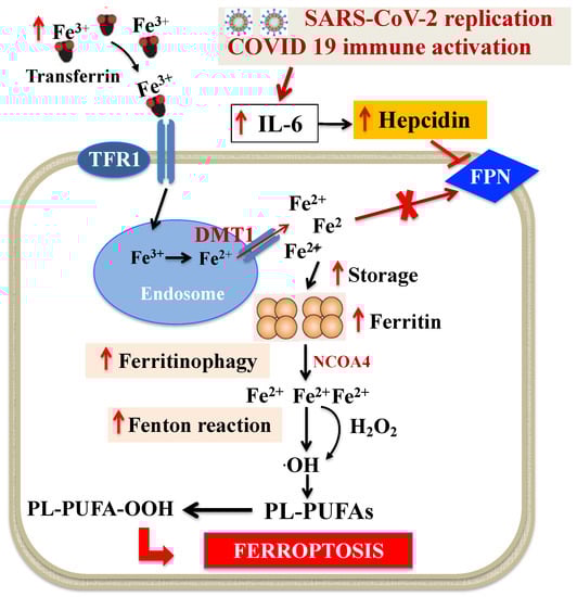 Dysregulation of iron metabolism (i.e., increased plasma levels of ferritin and decreased levels of iron and TF saturation) and anemia are frequently described in COVID-19 patients [24,37,65,66,67,68,69,70,71] and are suggested to play a main role in multiorgan failure of severe SARS-CoV-2 infection. In particular, data from observational studies, which have been confirmed in a large meta-analysis, showed that hemoglobin level decreases, particularly in older people, and is negatively associated with comorbidity and severity of the disease [65,66,68]. Additionally, higher levels of ferritin have been constantly reported in COVID-19 and between non-survivors and survivors, suggesting that mortality might be due to virally driven hyperinflammation [67,68]. Interestingly, anemia, hypoferremia and hyperferritinemia, which are constant features of COVID-19 patients, resemble anemia of inflammation [72]. In this context, Mehta et al. [73] have recently proposed that COVID-19 can be part of the broader spectrum of hyperinflammatory syndromes characterized by cytokine release and hyperferritinemia, one of the key features of these syndromes. It is well established that systemic immune activation leads to profound changes in iron trafficking, resulting in cellular iron retention and in reduced dietary iron absorption [46]. In response to microbial or viral molecules, multiple inflammatory cytokines and, in particular, interleukin-6 (IL-6) are released by cells of the immune system and alter systemic iron metabolism [74]. For viral replication, enhanced cellular metabolism and optimal iron levels within host cells are necessary [75]. In these conditions, IL-6 directly upregulates the expression of liver hepcidin, the master regulator of iron homeostasis, which inhibits the export of iron through FPN, causing cellular iron sequestration [74]. IL-6 also stimulates TFR1 with consequent transferrin internalization and iron accumulation [76]. Moreover, IL-6 increases intracellular ferritin, thus contributing to a decreased iron efflux from the cells [67]. Recent evidence indicates that this scenario may also be applicable to severe SARS-CoV-2 infection, which is characterized by an increase in cytokines, the so-called cytokine storm and especially IL-6 [73,77]. In this context, clinical studies have shown that beyond ferritin, circulating hepcidin levels are also increased in COVID-19 patients and are associated with disease severity [78,79,80]. Therefore, the cellular iron trapping in COVID-19 [65,66] may cause the degradation of ferritin through “ferritinophagy” [81,82] and triggers the increase in labile iron pool that converts phospholipid LOOH to hydroxyl radicals via the Fenton reaction and, eventually, promotes ferroptosis [41] (Figure 2).