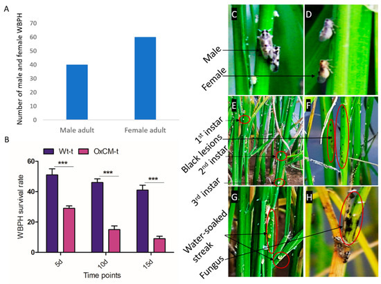 We infected rice plants with 40 male and 60 female WBPHs to evaluate the effects of WBPH on rice plants (Figure 1A). The number of females was higher than the number of males due to the higher death rate of females than males. We evaluated the survival rate of WBPHs in Wt-t and OxCM-t plants and found that the WBPH survival rate was reduced by 15% after 5 d, 51% after 10 d, and 67% after 15 d of infestation in OxCM-t plants compared with Wt-t plants (Figure 1B). The exact reason for WBPH death is still unknown, but we assumed that the OxCM plants were more resistant to the WBPH than the wild-type. Throughout our experiment, we noticed that both male and female WBPHs mostly fed on the lower stem, and newly hatched instar were observed on the lower stem (Figure 1C–E). After 3–5 days of infestation, symptoms mostly appeared on the lower part of the stem. Different symptoms appeared depending on the duration of infestation. The initial symptoms appeared in the form of small dark dots (Figure 1F). After about 10 to 15 days of continuous infestation, another symptom appeared in the form of water streaks on the lower stem and midrib of the leaves (Figure 1G). After continuous infestation for about a month, the new instar hatched and the plants came under the severe threat, turning yellow and starting to die (Figure 1H). At this stage, a fugal attack also appeared, which shows that WBPH infestation may also transmit fungal disease, as some of the insects act as a vector for bacteria and fungi.