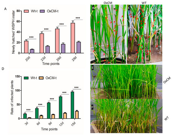 The population growth and survival rates of newly hatched instar WBPHs were determined. Usually, a single female WBPH laid about 119–158 eggs on the leaf midrib or stem in a cluster of 5–30 eggs, which were not visible to the naked eye [2]. After 17 to 20 days of infestation, new nymphal instars appeared on both Wt-t and OxCM-t plants. We counted the number of newly hatched instars after 20, 23, 26, and 29 days of infestation. We found that the WBPH population on Wt-t plants was approximately 2-fold higher than on OxCM-t plants after 20–29 days of infestation (Figure 2A). Figure 2B,C show few instars on OxCM-t plants, while Wt-t plants had substantial numbers of newly hatched instars, which are indicated by arrows, showing that OxCM plants are resistant to newly hatched WBPH and reduce the WBPH population. Further, we evaluated the rate of infestation of Wt-t and OxCM-t plants after 3, 6, 9, 12, and 15 days of infestation. The statistical analysis showed that the rate of infected plants increased substantially in Wt-t plants compared with OxCM-t plants (Figure 2D). The percentage of infected Wt-t plants increased by 4.5, 2.5, 3, 3, and 3.5 fold compared with OxCM-t plants after 3, 6, 9, 12, and 15 days of infestation, respectively. Figure 2E,F show the infestation pattern of OxCM-t and Wt-t plants, respectively, after WBPH infestation. These results showed the increased number of new instar on wild-type plants and high infection rate of wild-type plants indicated that wild-type plants were susceptible to WBPH, while transgenic plants showed enhanced tolerance toward WBPH.