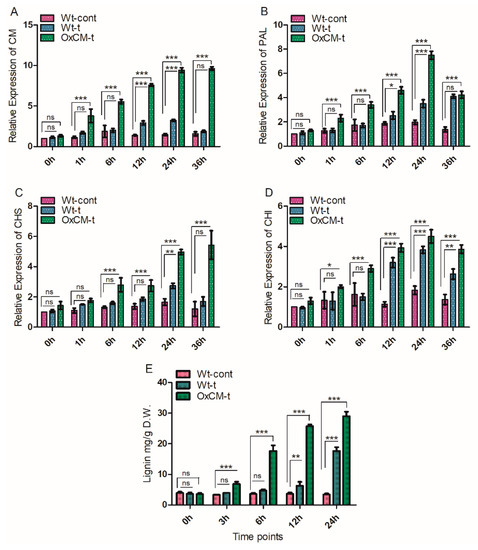 Over-expression of chorismate mutase (CM) gene positively regulates downstream genes and lignin accumulation. Relative transcriptional accumulation of (A) CM gene, (B) PAL gene, (C) CHS gene, and (D) CHI gene in the wild-type control (Wt-cont); wild-type infected with WBPH (Wt-t) and chorismate mutase transgenic over-expressor infected with WBPH (OxCM-t) plants in response to WBPH infestation. The relative expression of each gene was measured after 0, 1, 6, 12, 24, and 36 h of WBPH infestation. The actin gene was used as a reference gene. (E) Lignin quantification after 0, 3, 6, 12, and 24 h of infestation. Graph bars indicate the mean ± standard deviation (n = 3), ns indicates non significant and asterisks indicate significant differences (* p < 0.05, ** p < 0.01, *** p < 0.001) analyzed using two-way analysis of variance and Bonferroni post hoc test. The experiments were repeated three times.