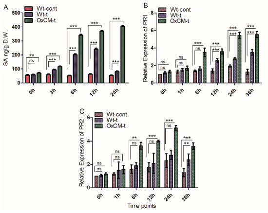 SA is an important phytohormone, which is induced during biotrophic pathogenic attack, and its deployment is monitored via PR genes [32,33]. Therefore, we aimed to investigate the role of the CM gene in SA pathway signaling and to evaluate the transcriptional regulation of the PR1 and PR2 genes, which are the key marker genes associated with the SA pathway. We investigated the accumulation of SA in OxCM-t and Wt-t plants in comparison with Wt-cont plants under WBPH pathogenic stress. We found that SA was significantly higher in both Wt-t and OxCM-t plants than Wt-control plants, but the accumulation of SA in OxCM-t plants was higher than in the Wt-t plants (Figure 4A). The accumulation of SA in Wt-t plants increased by 5%, 57%, 296%, 288%, and 50% after 0, 3, 6, 12, and 24 h of infestation, respectively, compared with Wt-cont plants. However, the accumulation of SA increased by 27%, 94%, 568%, 493%, and 48% in OxCM-t plants after 0, 3, 6, 12, and 24 h of infestation, respectively, compared with Wt-t plants. This indicates that over-expression of the CM gene significantly increases the accumulation of SA associated with WBPH infestation. Initially, the expression of the PR1 gene in Wt-t plants was not significantly different to that in Wt-cont plants. However, after 12, 24, and 36 h of infestation, PR1 gene expression was significantly higher in Wt-t plants than Wt-cont plants (Figure 4B). Additionally, PR1 expression was significantly regulated in OxCM after 6, 12, 24, and 36 h of infestation, and the expression level increased consistently compared with the Wt-cont plants (Figure 4B). Moreover, the PR2 gene was also upregulated in a similar manner to PR1 gene in the OxCM-t plants: after 6, 12, 24, and 36 h of infestation. However, the PR2 gene in the Wt-t plants was not significantly upregulated compared with the Wt-cont plants until 36 h after infestation (Figure 4C). This transcriptional regulation pattern indicates that SA is responsible for the induction of the PR1 and PR2 genes during WBPH infestation. These results show that transgenic plants under WBPH infestation increase endogenous SA level as well as induce SA signaling.
