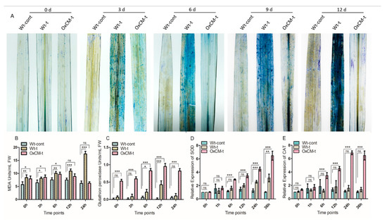 The HR is an important defense system that is initiated at the site of infestation. As the HR, ROS, and antioxidants are interlinked in the defense system, we investigated the HR using quantitative visualization of tryptophan blue, we quantified lipid peroxidase (MDA, malondialdehyde) and glutathione peroxidase (GPx), and we evaluated the level of expression of the SOD and CAT genes (Figure 5). Leaf samples were collected randomly for the detection of cell death from Wt-cont, Wt-t, and OxCM-t plants after 0, 3, 6, 9, and 12 days of infestation. We found substantial cell death in Wt-t leaves after 9 and 12 days of infestation compared with Wt-cont and OxCM-t plants (Figure 5A). This extensive cell death in Wt-t plants shows that they are more susceptible to WBPH infestation. Furthermore, the antioxidant evaluation indicated that MDA was significantly (p < 0.001) enhanced consistently throughout the infestation in the Wt-t plants compared with Wt-cont plants (Figure 5B). However, MDA accumulation did not increase significantly (p < 0.05) in OxCM-t plants after 0, 3, and 6 h of WBPH infestation, while it reduced after 12 and 24 h of infestation. Unlike MDA, the GPx concentration was significantly (p < 0.001) and consistently enhanced in the OxCM-t plants compared with the Wt-cont plants after WBPH infestation (Figure 5C). The accumulation of GPx in Wt-t plants in response to WBPH stress was also significantly enhanced after 6 and 12 h of infestation compared with Wt-cont plants. The accumulation of MDA and GPx in the transgenic line indicated that MDA reduces and GPx increases with increasing WBPH infestation. We investigated the transcriptional level SOD and CAT gene in Wt-cont, Wt-t, and OxCM-t plants after 0, 3, 6, 12, 24, and 36 h of WBPH infestation to further evaluate the antioxidant apparatus in response to WBPHs (Figure 5D,E). The quantitative transcription of SOD and CAT showed the same pattern of expression: they were enhanced consistently and significantly (p > 0.001) after 6, 12, 24, and 36 h of WBPH infestation compared with Wt-cont plants. Additionally, there was a significant (p < 0.001) increase in SOD in Wt-t plants after 24 h of infestation compared with Wt-cont plants (Figure 5D), while irregular expression of CAT was found in Wt-t plants throughout the infestation period (Figure 5E). The transcriptional regulation of both the SOD and CAT genes indicated that the CM gene is associated with the regulation of antioxidant-related genes.