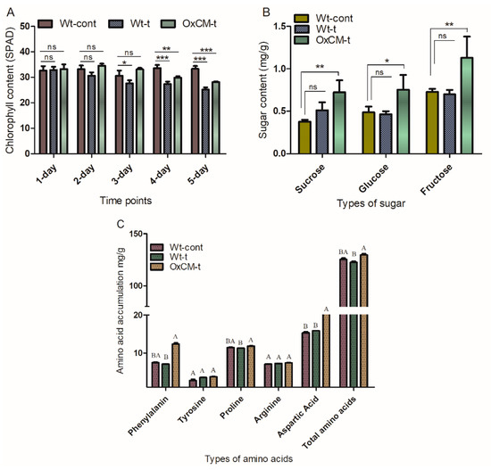 We compared the chlorophyll, sugar, and amino acid contents of Wt-t and OxCM-t plants with Wt-control plants. The chlorophyll contents were investigated after 1, 2, 3, 4, and 5 days of infestation, and we found significant (p < 0.001) decreases in both Wt-t and OxCM-t plants after 4 and 5 days compared with Wt-cont plants (Figure 6A). Initially, the chlorophyll contents were increased in the OxCM-t plants compared with the Wt-control. However, after 4 and 5 d, the chlorophyll contents were reduced. However, throughout the infestation, the chlorophyll concentration in the OxCM-t plants was higher than in the Wt-t plants. Sucrose, glucose, and fructose were also significantly enhanced (p < 0.001) in OxCM-t plants compared with Wt-t plants (Figure 6B). Furthermore, we investigated the phenylalanine, tyrosine, proline, arginine, aspartic acid, and total amino acid concentrations in all three groups of plants (Figure 6C). We did not find any significant difference in tyrosine and arginine, while phenylalanine, proline, aspartic acid, and total amino acids were significantly enhanced in OxCM-t plants compared with Wt-cont plants. In contrast to OxCM-t plants, phenylalanine, proline, and total amino acids were significantly reduced in Wt-t plants compared with Wt-cont plants, which indicates that phenylalanine, proline, and total amino acids could be directly or indirectly involved in the mitigation of WBPH infestation.