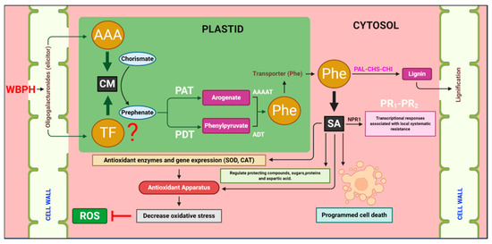 Proposed model of the molecular mechanisms of white-backed planthopper (WBPH) resistance in rice plants. WBPH infection stimulates the expression of chorismate mutase (CM) gene, which converts chorismate into prephenate. Prephenate is either converted into arogenate by prephenate aminotransferase (PAT) or to phenylpyruvate by prephenate dehydratase (PDT). Both arogenate and phenylpyruvate are catalyzed by aromatic amino acid amino transferase and arogenate dehydratase (ADT), respectively, to produce phenylalanine (Phe). This entire process occurs in the plastid. Phe is transported into the cytosol through the Phe transporter and is converted to lignin and salicylic acid. The induction of the CM gene regulates downstream lignin synthesizing genes, such as, phenylalanine ammonia lyase (PAL), chalcone synthase (CHS), and chalcone isomerase (CHI), which enhance lignification in the cell wall in response to pathogen infestation. CM gene induction also regulates the SA signaling, which induces catalase (MDA), glutathione peroxidase (GPx), and antioxidant-related genes, such as superoxide dismutase (SOD) and catalase (CAT), which scavenge reactive oxygen species (ROS) and reduce oxidative stress.