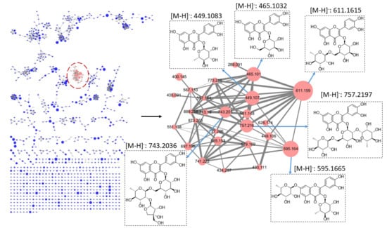 The present study showed that the crude extracts of Djulis hull exhibited a better DPPH free radical scavenging activity (IC50 value: 32.7 µg/mL) and higher TPC (89.6 ± 3.8 mg of GAE/g) than those of Djulis kernel (IC50 value: 324.8 µg/mL, TPC: 28.7 ± 0.5 mg of GAE/g). In addition, among all derived soluble fractions from Djulis hull crude extracts, the BuOH fraction exhibited a better DPPH free radical scavenging performance (IC50 value: 19.0 µg/mL), higher TPC (188.1 ± 3.3 mg of GAE/g), and higher TFC (34.6 ± 1.1 mg of QE/g) than Hex (IC50 value: >100 µg/mL, TPC: 17.3 ± 0.7 mg of GAE/g, TFC: 13.3 ± 0.2 mg of QE/g), EtOAc (IC50 value: 39.1 µg/mL, TPC: 289.0 ± 4.7 mg of GAE/g, TFC: 25.9 ± 0.4 mg of QE/g), and water (IC50 value: 38.1 µg/mL, TPC: 84.7 ± 0.9 mg of GAE/g, TFC: 3.8 ± 0.0 mg of QE/g) fractions. To further understand the metabolomic features of Djulis hull extracts, we conducted molecular networking analysis through GNPS. The results were further visualized using Cytoscape. Our results revealed that 1133 nodes (a node represents a precursor ion of a metabolite) and more than 50 molecular clusters (the connected nodes that have structural similarity will be grouped into a cluster) were found in the molecular networking analysis. In this study, 94 metabolites were annotated by the GNPS library (https://gnps.ucsd.edu/ProteoSAFe/status.jsp?task=192751dbccb74afaa89725d77e31bd64, accessed on 22 June 2021).
