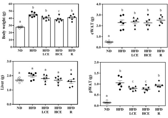 Effect of Djulis hull crude extract and rutin on body weight and tissue weight in HFD-induced obese mice. ND: normal diet; HFD: high-fat diet; LCE: low dosage of crude extract; HCE: high dosage of crude extract; R: rutin; eWAT: epididymal white adipose tissue; pWAT: perirenal white adipose tissue. Values represent the mean ± SEM (n = 6). Statistical methods were used by one-way ANOVA, and the different letters are significantly different at p < 0.05.