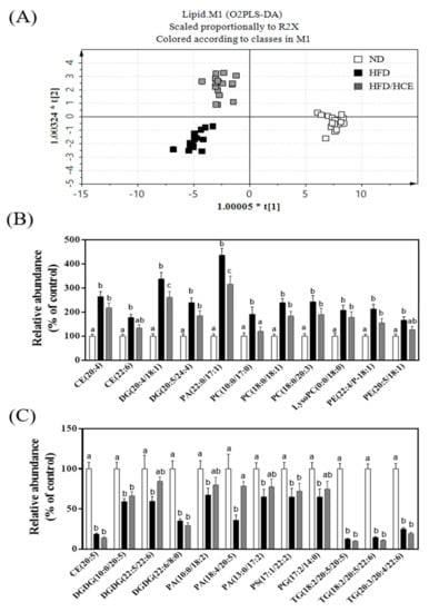 Effect of Djulis hull crude extract on lipidomics in HFD-induced obese mice. (A) The orthogonal partial least-squared discriminant analysis (OPLS-DA) score plot for ND, HFD and HFD/HCE groups. The x-and y-axes of OPLS-DA showed the variance explained among the groups. (B) Compared with the ND group, the lipid species increased in the HFD group. (C) Compared with the ND group, the lipid species decreased in the HFD group. ND: normal diet; HFD: high-fat diet; HCE: high dosage of crude extract. Values represent the mean ± SEM (n = 6). Statistical methods were used by two-way ANOVA, and the different letters are significantly different at p < 0.05.