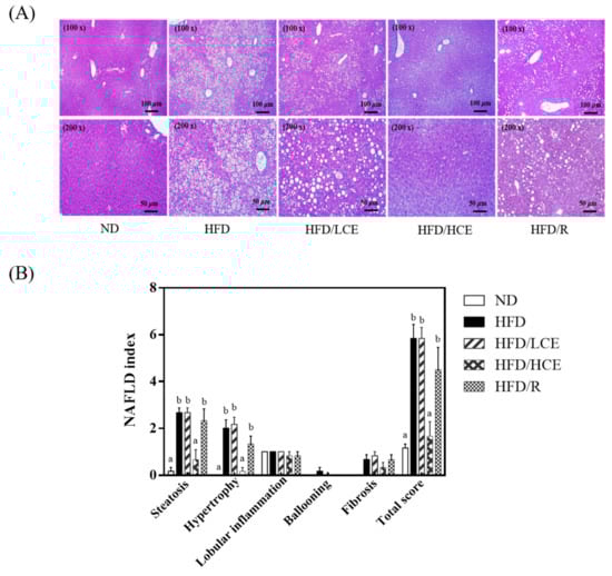 Effect of Djulis hull crude extract and rutin on pathological indices in HFD-induced obese mice. (A) Representative hematoxylin and eosin staining of liver sections. (B) NAFLD index calculated from individual scores for steatosis, hypertrophy, lobular inflammation, ballooning and fibrosis. ND: normal diet; HFD: high-fat diet; LCE: low dosage of crude extract; HCE: high dosage of crude extract; R: rutin. Values represent the mean ± SEM (n = 6). Statistical methods were used by one-way ANOVA, and the different letters are significantly different at p < 0.05.