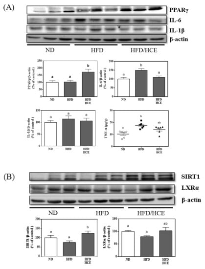 The protein levels of SIRT1 and LXRα in the HFD group were decreased by 24.6% (p < 0.05) and 20.5% (p < 0.05), respectively, compared to those in the ND group. However, SIRT1 and LXRα protein expression increased in the HFD/HCE group by 65.2% (p < 0.05) and 29.6% (p = 0.12), respectively, compared to the HFD group (Figure 6B).