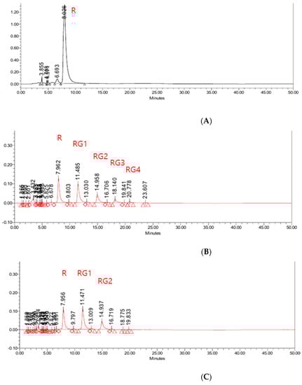 Rutin and rutin glycosides analyzed by HPLC during enzyme reaction. (A) Rutin before enzyme reaction, (B) rutin poly-glucosides after cyclodextrin glycosyl transferase (CGTase) reaction, (C) rutin mono-glucoside and rutin di-glucoside after β-amylase reaction. R; rutin, RG1; rutin mono-glucoside, RG2; rutin di-glucoside, RG3; rutin tri-glucoside, RG4; rutin tetra-glucoside.