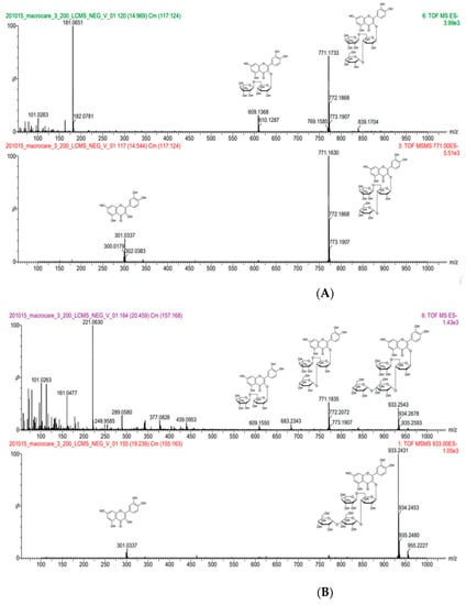 The protonated molecular ion of rutin diglucoside at m/z 933.2543 produced fragment ions at m/z 771.1835 by losing a glucose moiety and 609.1550 by losing a maltose moiety. The protonated molecular ion of rutin diglucoside at m/z 933.2431 produced fragment ions at m/z 301.0337 by losing a maltose and rutinose moiety (Figure 3B).