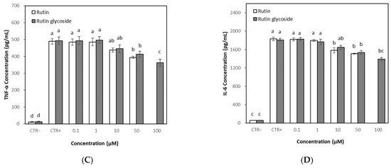 Effect of rutin and rutin glycoside on the production of nitric oxide (NO), Prostaglandin E (PGE) 2, tumor necrosis factor (TNF)-α and interleukin (IL)-6. RAW 264.7 cells were cultured with different rutin and rutin glycoside concentrations for 24 h with LPS (1 μg/mL). CTR−, Negative control. CTR+, Positive control (LPS). Results were represented as mean ± SD (n = 3). (A) Effect on NO; (B) Effect on PGE2; (C) Effect on TNF-α; (D) Effect on IL-6. Different letters (a, b, c, d) above the bars indicate significant differences (p < 0.05), where ab or bc represents the intermediate significance value between a and b or b and c, respectively.
