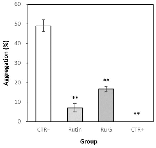 The aggregation rates of platelet-rich plasma (PRP) in vitro. Each time point represented the mean ± S.E. (n = 3). CTR−; normal control (distilled water), CTR+; positive control (aspirin), Ru G; rutin glycoside. Significant differences from the normal control group were identified using Independent t-test (** p < 0.01).