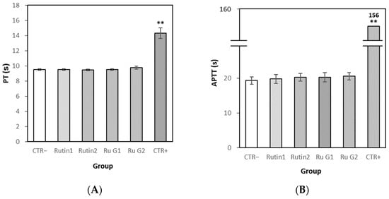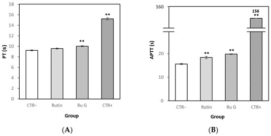 PT (A) and APTT (B) of PPP in vivo. Each time point represented the mean + S.E. n = 8 (G2, n = 4). CTR− means normal control, CTR+ means positive control (heparin), Ru G means rutin glycoside. Significant differences from the normal control group were determined via Independent t-test (** p < 0.01). No statistically significant differences were noted in the substance groups from the normal control group (p > 0.05).