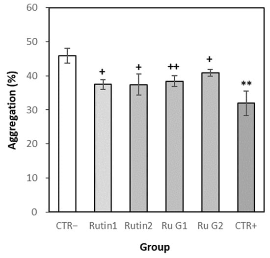 The aggregation rates of PRP in vivo. Each time point represented the mean ± S.E. (n = 8). CTR−; normal control, CTR+; positive control (aspirin), Ru G; rutin glycoside. Significant differences from the normal control group were determined via Independent t-test (** p < 0.01). Significant differences from the normal control group were determined via Dunnett’s t-test (+ p < 0.05, ++ p < 0.01).